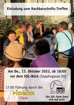 SOL organisiert wieder ein Nachbarschaft-Café mit Führung durch die Pionier-Oase. Das Treffen findet am Donnerstag, dem 13.10. ab 16:00 Uhr vor dem SOL-Büro (Sapphogasse 20, 1100 Wien) statt. Bei gemütlichem Beisammensein und Kaffee und Kuchen sind nicht nur alle Nachbar*innen eingeladen, sondern auch all jene, die SOL kennenlernen möchten und an der Pionier-Oase interessiert sind. Wir freuen uns auf dein Kommen!
