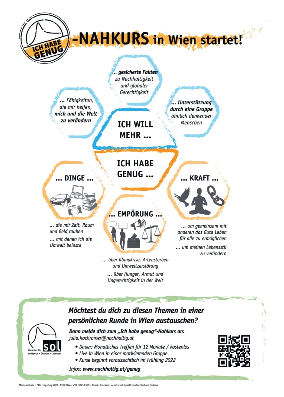 Im „Ich habe genug“-Kurs kannst du dich ein Jahr lang intensiv mit dem „GENUG-HABEN“ geschäftigen. Im Frühjahr geht es los. 1 Jahr, 12 Lektionen, regelmäßige Treffen und eine motivierende Klassengemeinschaft. Jetzt zum "Ich habe genug"-Nahkurs anmelden! Infos und Anmeldung
