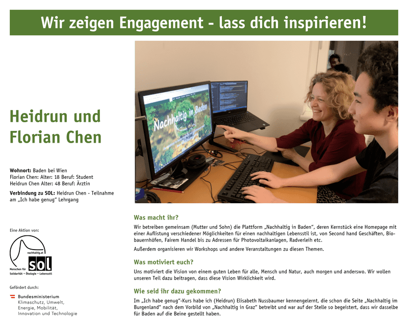 Diesmal: Gemeinsam für mehr Nachhaltigkeit in der Region! Heidrun und Florian Chen (Mutter und Sohn) sind die GründerInnen der Plattform "Nachhaltig-in-Baden".